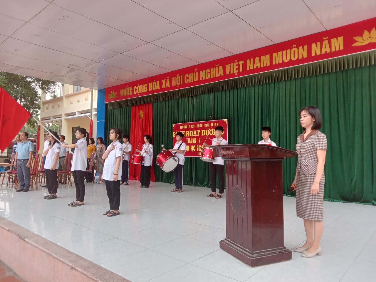 Đến dự Sinh hoạt dưới cờ có thầy Hoàng Tôn Quyền - Bí thư chi bộ - Hiệu trưởng nhà