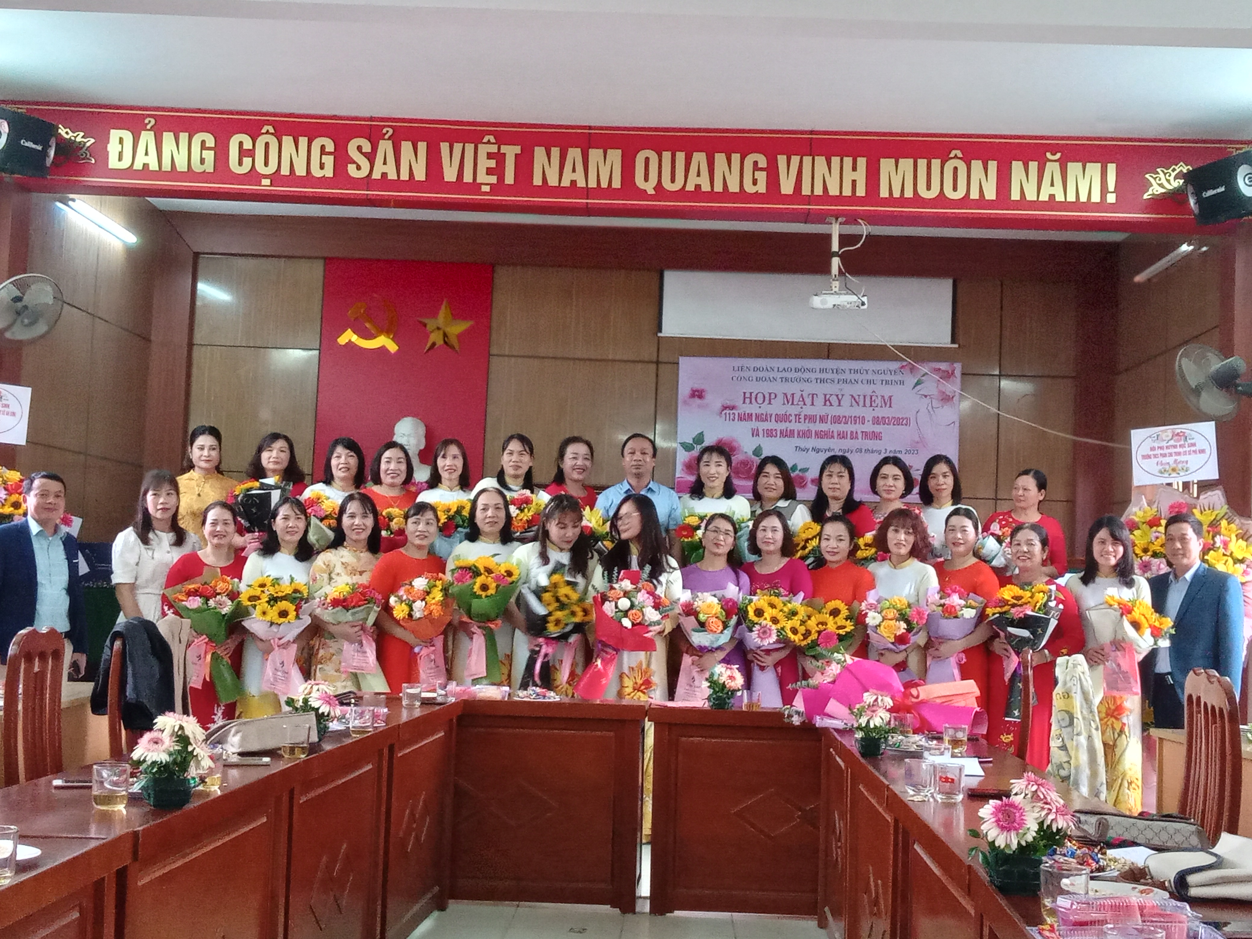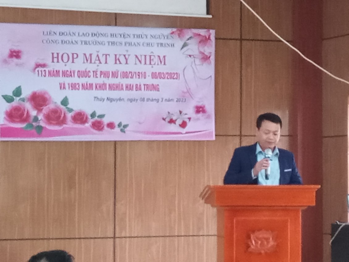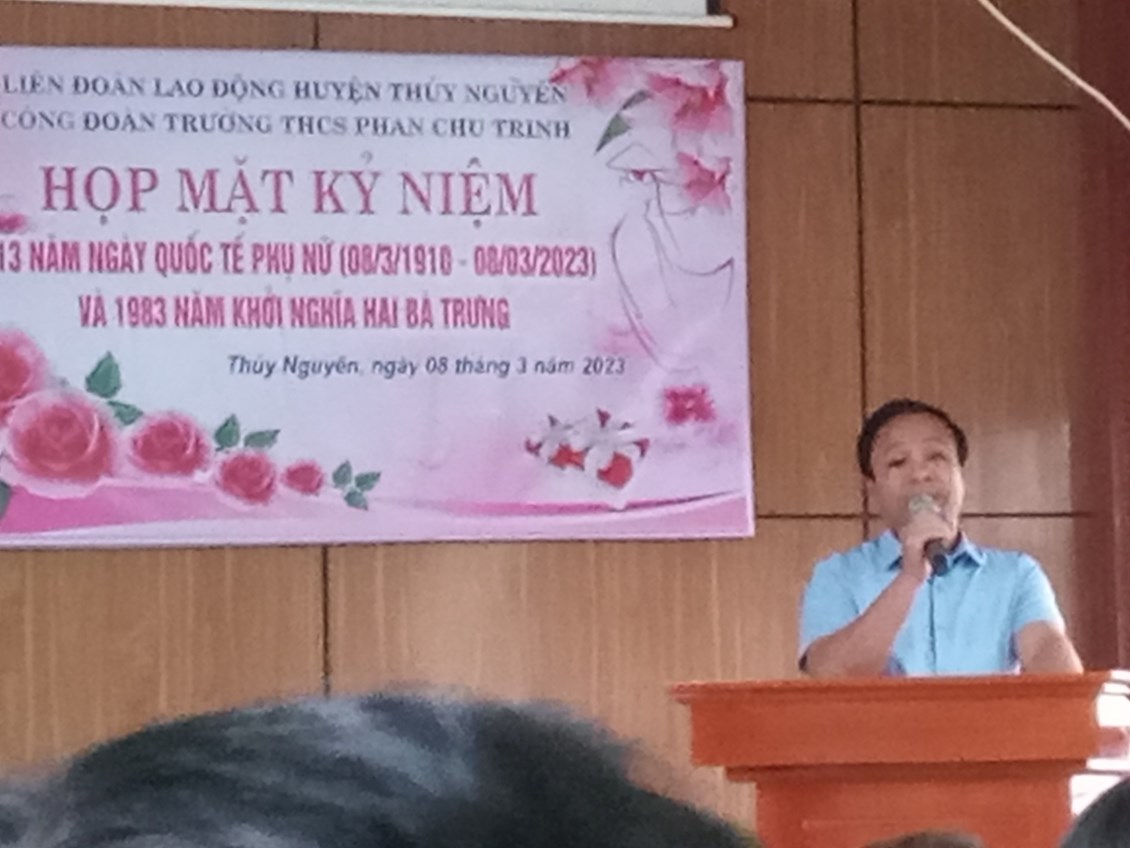 Thầy Hoàng Tôn Quyền (hiệu trưởng nhà trường) phát biểu ý nghĩa ngày 8/3 và chúc mừng chị em luôn xinh đẹp, hạnh phúc, và hoàn thành xuất sắc nhiệm vụ.