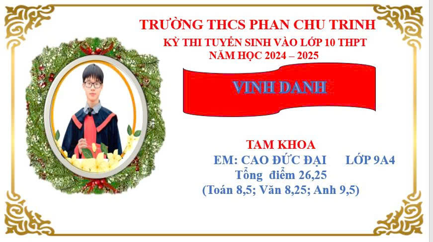 Xin chúc mừng em Cao Đức Đại– học sinh lớp 9A4, đã xuất sắc trở thành TAM KHOA TRƯỜNG THPT LÊ ÍCH MỘC với tổng điểm 26,25: